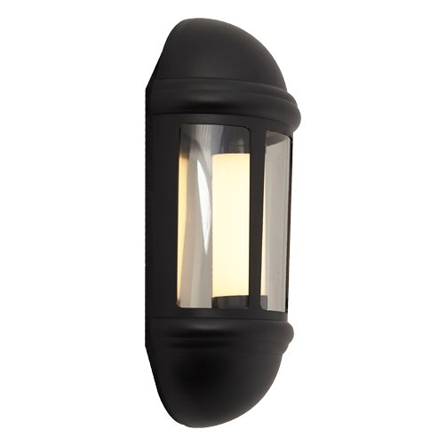 Contemporary corrosion resistant, non-dimmable, IP65 half lantern with textured polycarbonate finish and tinted lens. LED light bar for uniform light output and PIR option for convenience and security, which includes manual override. Ideal for commercial, residential, and coastal.