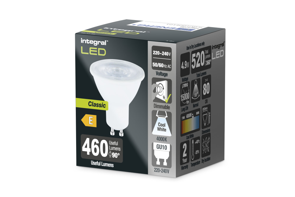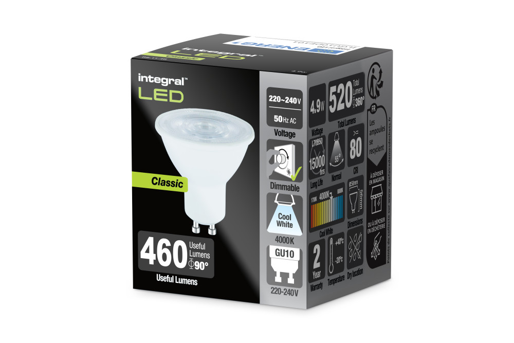 This GU10 lamp offers a wider beam angle of 55 degrees, which will cover a larger area in light with fewer lamps than other GU10 spotlights. The LEDs are specially arranged for a COB-like effect, which paired with the diffuser lens creates a light quality very similar to traditional halogen spotlights.