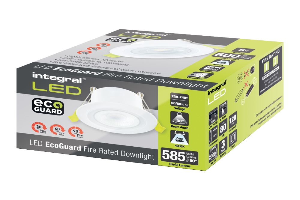 Integral Ecoguard Fire Rated Downlight 65Mm Cutout IP65 600Lm 5W 4000K 38 Beam Dimmable 120Lm/W White