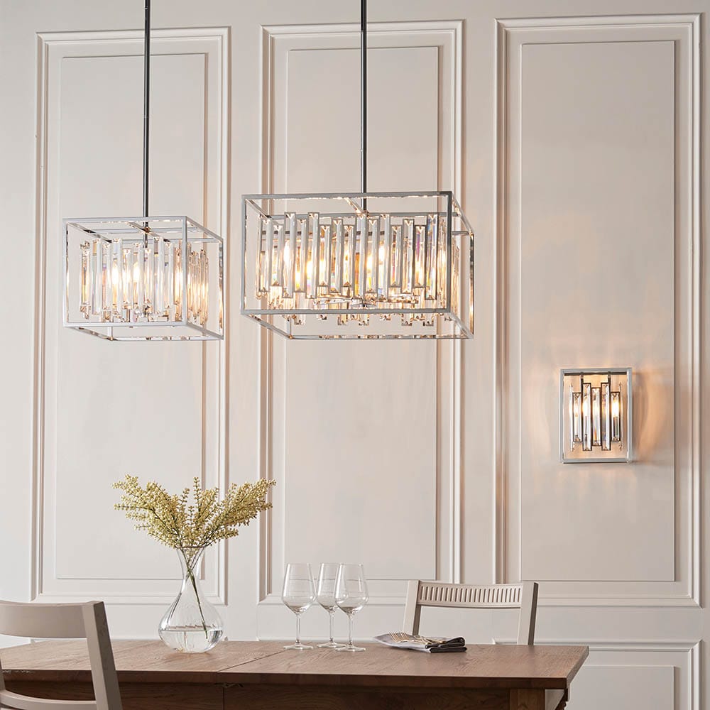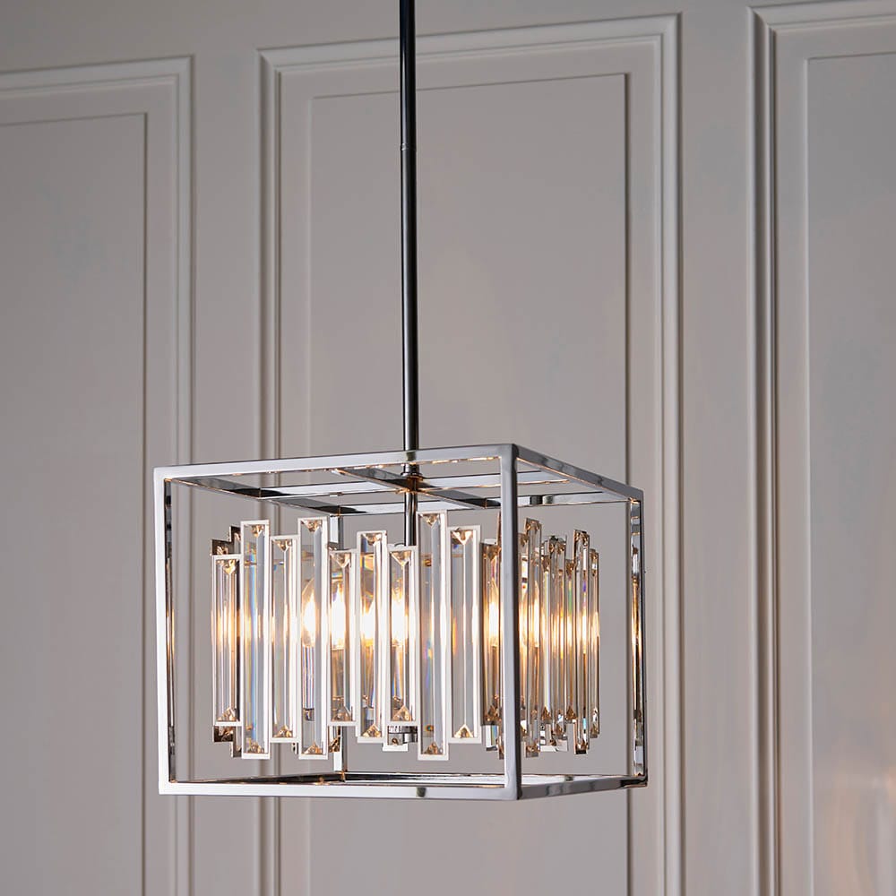 A striking mix of modern and classic styling, high quality bevelled glass crystals are effortlessly framed within modern polished chrome metalwork, the perfect touch of opulent style and on-trend design. Fully height adjustable for a close to the ceiling flush or an impressive long drop chandelier