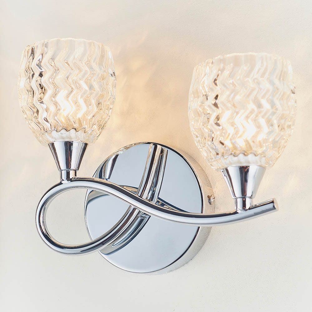 A twin wall light with curved metal arms sweeping to the left in a chrome finish and cut glass shades. suitable for use with LED lamps and dimmable. Matching items and other colour options available