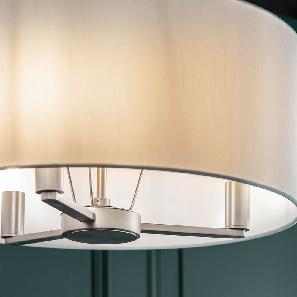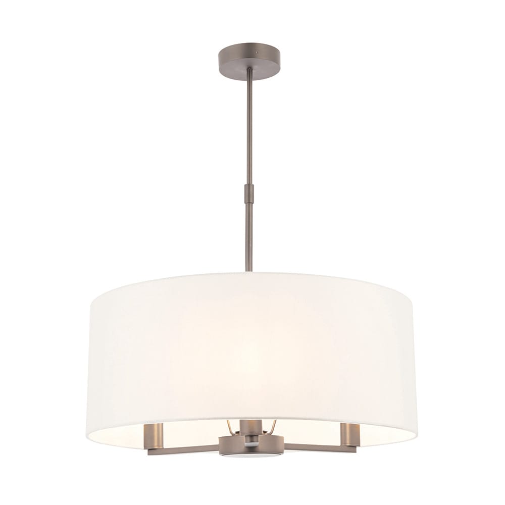 An understated modern 3 light pendant, mixing a subtle brushed plated finish with a large timeless vintage white faux silk shade. Modern styling for today’s interiors.Matching items also available