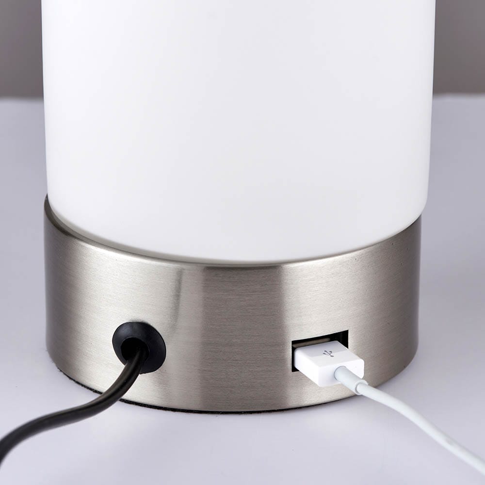 A sleek dual purpose table light finished in a brushed nickel effect plate, with a matt opal glass shade. This light is operated by clever 3 stage touch technology, plus has the addition of a discreet USB port meaning it can charge your devices too