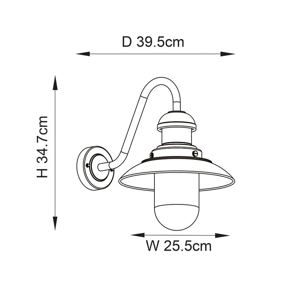 Modern traditional exterior wall light with textured black finished metalwork and curved fisherman’s arm. Clear glass shade perfect for use with E27 LED filament lamps. IP44 rated for safe exterior use.