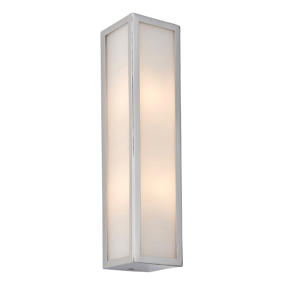 Simple yet stylish contemporary wall light with chrome plate finish and frosted glass diffuser. Dimmable and IP44 rated ideal to create a relaxing ambient light in any bathroom. Smaller size also available.