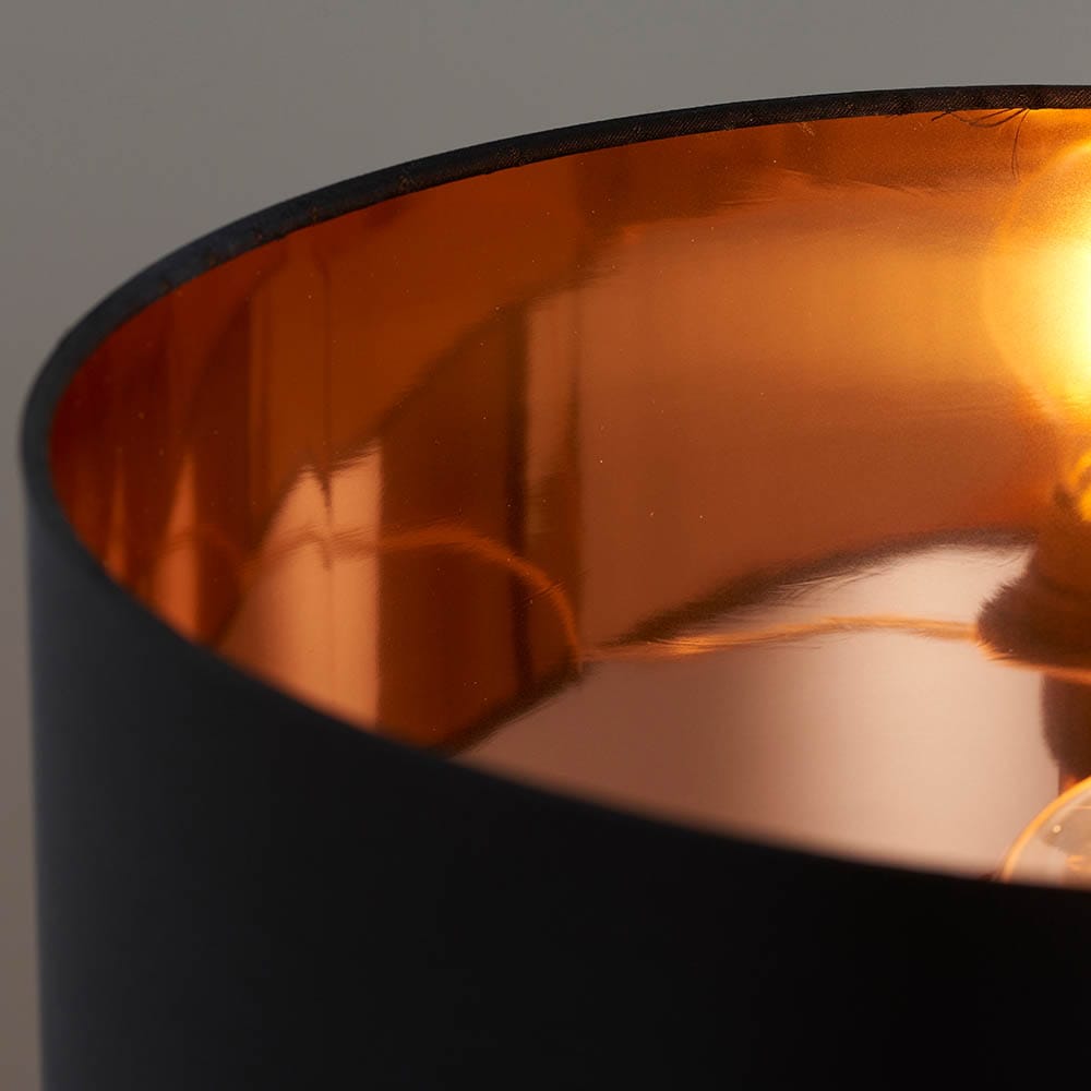 The Waldorf glass table lamp has a high shine copper effect base with a black faux silk shade which has a copper effect reflective inner. Fitted with inline switch suitable for use with LED lamps
