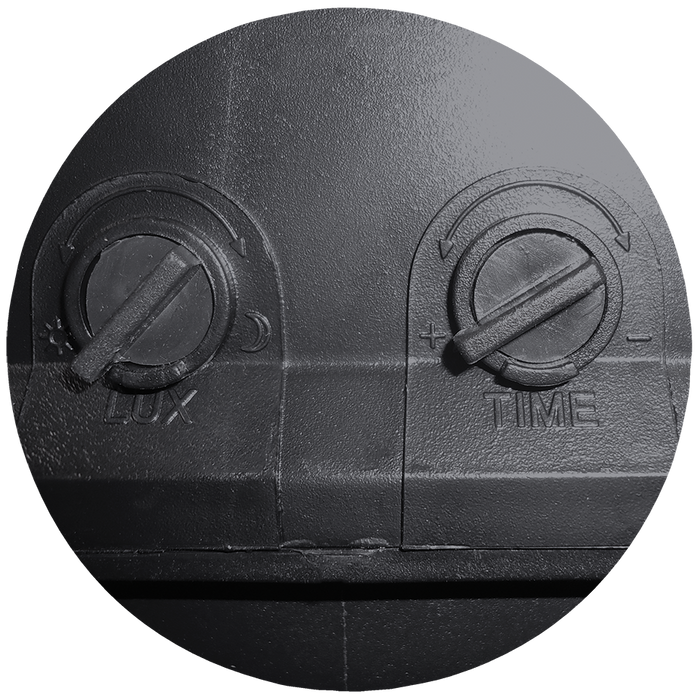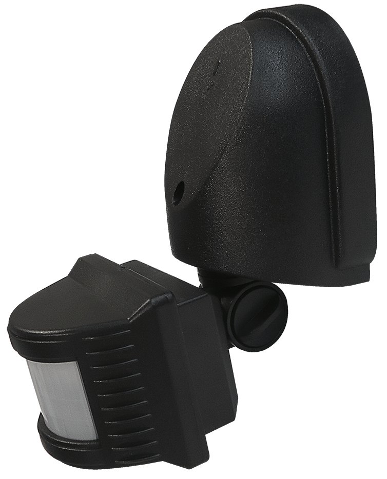 IP44 external 110° adjustable black PIR detector able to control upto 1000W of incandescent loads and 200W LED loads, with upto 12 metre detection range and time adjustment from 5 seconds upto 5 minutes