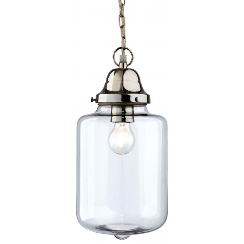 Featuring a brushed steel chain and gallery this interesting jar shaped clear glass is ideal for contemporary room settings.