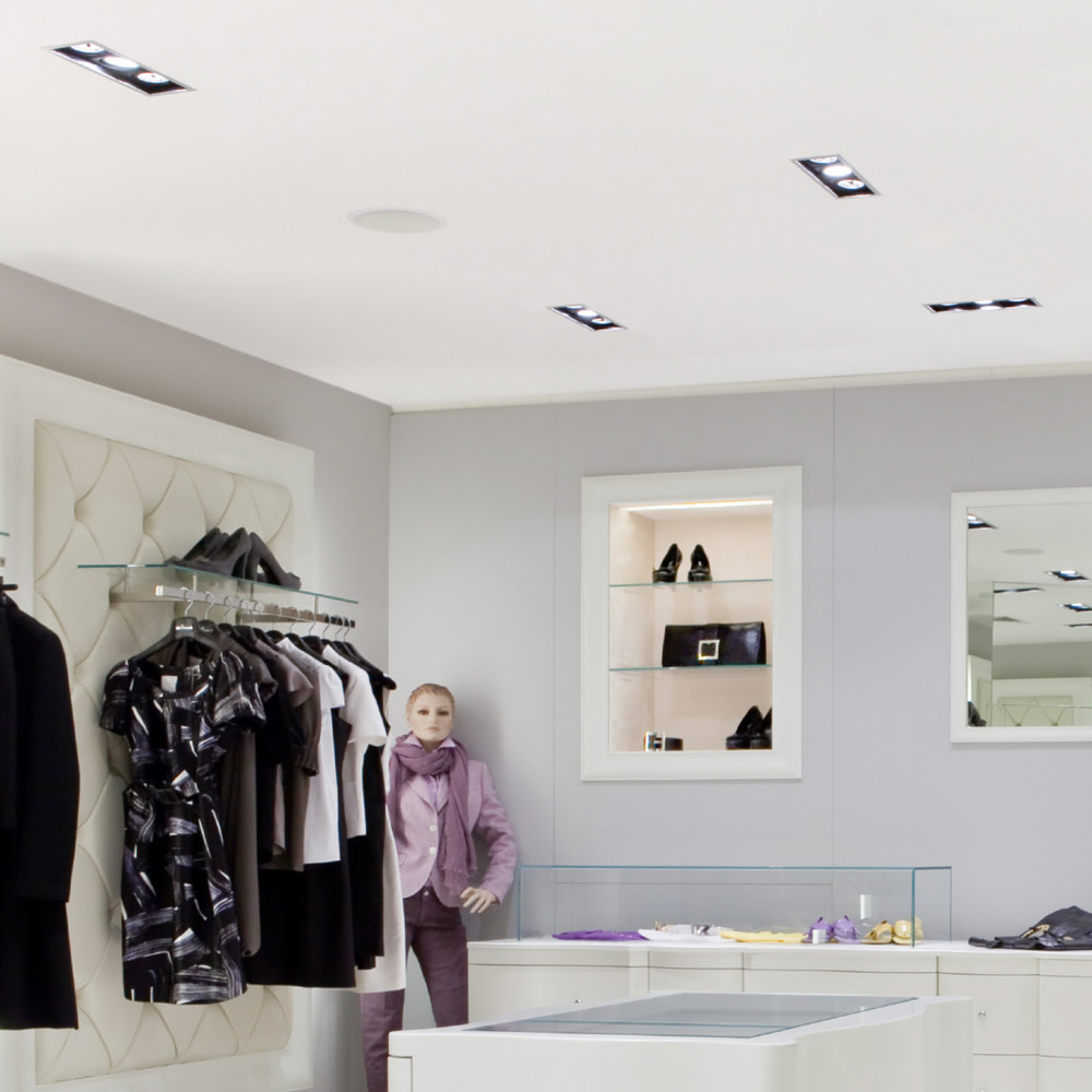 AccentPlus Gimbal downlights are the perfect cost-effective solution for retail environments. They take virtually every GU10 or MR16 bulb on the market as well as Integral LED’s light modules for a more powerful light output (see related products below). For installations where perfect colour rendering is required, we recommend our high CRI GU10’s. The fitting is 30 degrees tiltable in both directions and the light beam can be further fine-tuned by placing the inner ring at the required position through 365° on the horizontal plane. Bulb replacement is also simple and quick, with the inner ring being removable from the front face of the fitting, rather than having to remove the whole fixture from the ceiling.