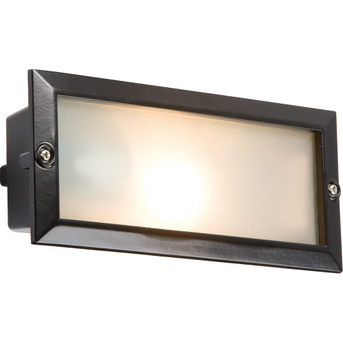 IP44 E27 Aluminium Base Bricklight Unit supplied with interchangeable black covers in louvred and open frames. E27 40 Watt lampholder. E27 40W lamp (not supplied with fitting product code HALO-G28ES). Fits standard UK brick size. 6mm frosted glass front. Electrical termination via 10 Amp connector block within fitting. Recessed wall mounted. Dimmable.