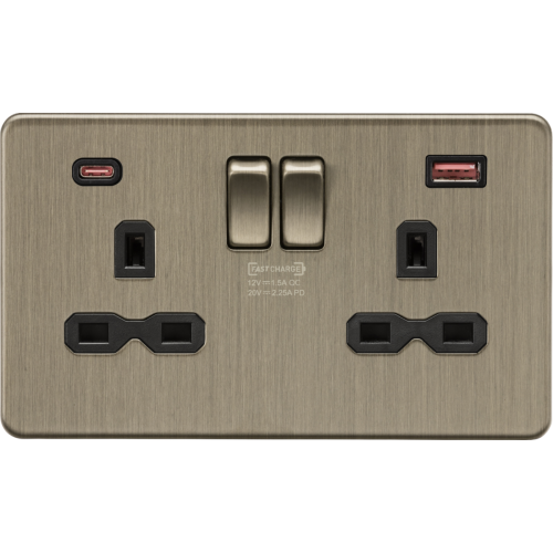 These metal decorative screwless USB charging sockets output at a Max. 45W over the USB-C port, they are ideal for location where you might want a fast charge. They come with the latest USB-C port for the latest equipment and a legacy USB-A port for charging older devices. They intelligently switch the voltage to give your device what it needs. Ideal for homes, offices, home offices, coffee shops, bars, restaurants, hospitality areas or anywhere a convenient FASTCHARGE might be needed.Supports USB-PD – a recognized standard for charging devices using a USB connection. To take advantage of this your device must support USB-PD. Also supported is the older QC standard over USB-A which is found on Qualcomm-based devices. 13A 230V 50Hz Double Pole Twin Earth Dual USB A+C Voltage Switching technology up to 20V DC 2.25A. Max. 45W Delivering up to 45W over USB-C -enough to power tablets and small laptops Dual Fast Charge – continues to deliver when both ports are in use giving up to 27W over USB-C and 18W over USB-A Over Voltage CAT III – suitable for domestic and commercial installations Built-in Overload, Overheat and Over Current ProtectionNB: We recommend you only use certified USB cables for safety and to ensure compatibility, it is also important to ensure your USB can handle the power output most cheap USB cables are only rated to 30W, some to 60W we recommend only using 60W+ rated cables with this device.