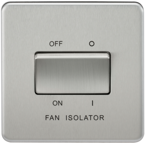 Ideal for providing a safe and simple method of isolating fan units in en-suite bathrooms, family bathrooms, utility rooms, store rooms etc. Often the fan unit will be wired into the lighting circuit for convenience and efficiency. With this kind of installation there is often a need to leave the lighting circuit live whilst isolating the fan for maintenance. Flawless Screwless low profile metal design with matching metal rocker.- 10A rated- Triple Pole- Screwless low profile design with built in gasket- Rated conditional short circuit current (Inc) 1500A – Certified to EN 60669-1, EN 60669-2-4- Minimum mounting box 16mm