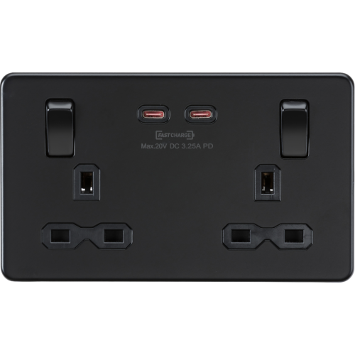 These metal decorative screwless USB charging sockets output at a Max. 65W over either of the USB-C port, they are ideal for locations where you might want a fast charge or to power a device like a laptop. They intelligently switch the voltage to give your device what it needs. Ideal for homes, offices, home offices, coffee shops, bars, restaurants, hospitality areas or anywhere a convenient power supply for charging and powering devices like laptops is needed.Supports USB-PD – a recognized standard for charging devices using a USB connection. To take advantage of this your device must support USB-PD. Also supported is the new PPS protocol that focuses on precise control of voltage and current during charging making it ideal for laptops 13A 230V 50Hz Double Pole Twin Earth Dual USB C Voltage Switching technology up to 20V DC 3.25A. Max. 65W Delivering up to 65W over USB-C -enough to power tablets and small laptops Dual Fast Charge – continues to deliver when both ports are in use giving up to 45W and 18W Over Voltage CAT III – suitable for domestic and commercial installations Built-in Overload, Overheat and Over Current ProtectionNB: We recommend you only use certified USB cables for safety and to ensure compatibility, it is also important to ensure your USB can handle the power output most cheap USB cables are only rated to 30W, some to 60W we recommend only using 100W+ rated cables with this device.