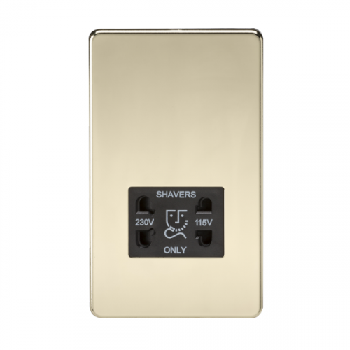 Perfect upgrade to any bathroom, dual voltage shaver socket, flawless Screwless low profile metal design. 115/230VAC 20VA IP41 Dual Voltage Shaver Socket Screwless low profile design with built in gasket Certified to EN 61558 Minimum mounting box depth: 47mm