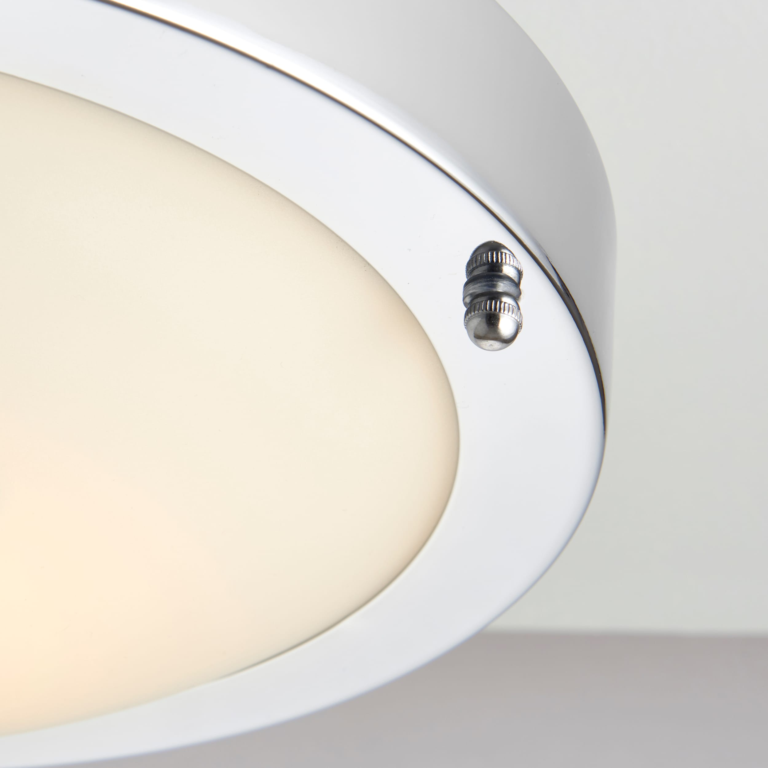 The popular Portico bathroom ceiling light features frosted glass and chrome finish. This fitting is dimmable, suitable for use with LED lamps and IP44 rated