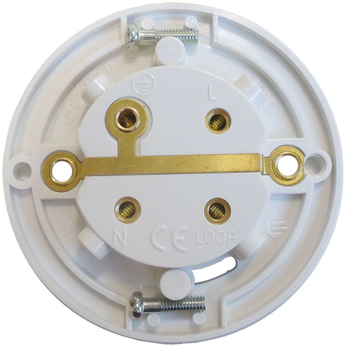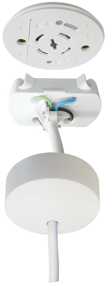 Pre wired plug in white ceiling rose with 2 metres heat resistant 4 core flex rated to 6 amps with 4 terminals built in enabling an extra live connection, designed for Besa box mounting