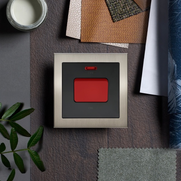 The Aura 45 Amp Switch with Neon in Brushed Nickel is the ideal solution for safely controlling high-powered appliances such as electric cookers, hobs, or showers. Featuring a large, easy-press rocker and a neon indicator, it provides clear visibility when the circuit is active—offering both safety and convenience. The Brushed aluminium front panel delivers a sophisticated, modern look, perfectly suited to premium interiors. With a two-stage modular installation, the base unit is fitted first, then the front plate clips on after decorating for a crisp, mark-free finish. Part of the Aura range, this switch blends durability, style, and performance—ideal for both residential and commercial applications.