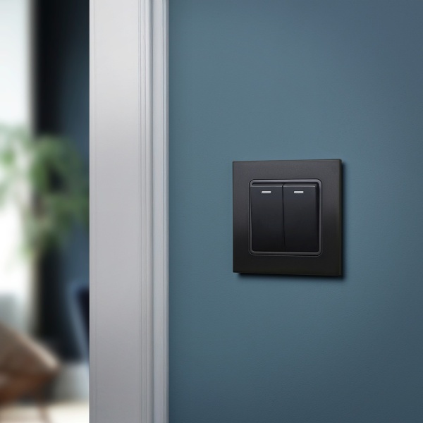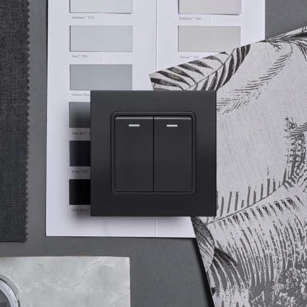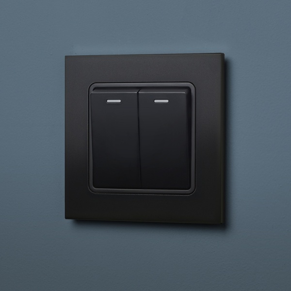 The Aura 2-Gang Retractive Switch in Matt Black offers a sleek and flexible solution for smart lighting control, blinds, or automation systems. Its modern aluminium front panel and minimalist design provide a sophisticated finish that suits any interior. Designed with a two-stage modular system, the base unit is installed first, followed by the front panel after decorating—ensuring a clean, mark-free look. The retractive (momentary) action makes it perfect for use with smart relays, dimmers, or control systems. Need a change in style? Just clip on a new panel—no rewiring required. Durable and design-forward, it's ideal for residential or commercial spaces where style meets smart functionality.