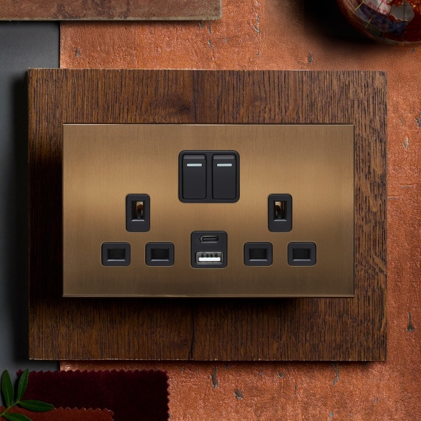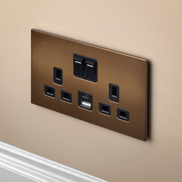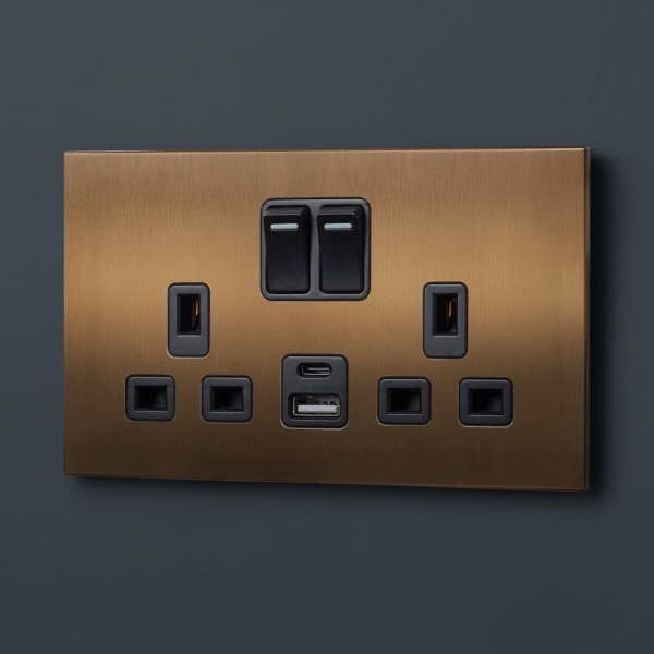 The Aura Double Plug Socket in Brushed Bronze combines sleek aesthetics with modern functionality, featuring integrated USB-A and USB-C ports for fast, effortless device charging.