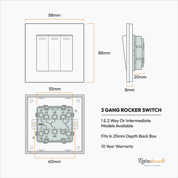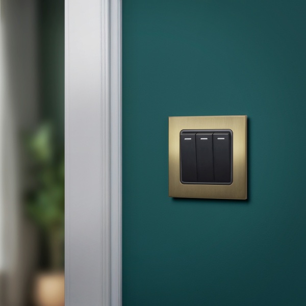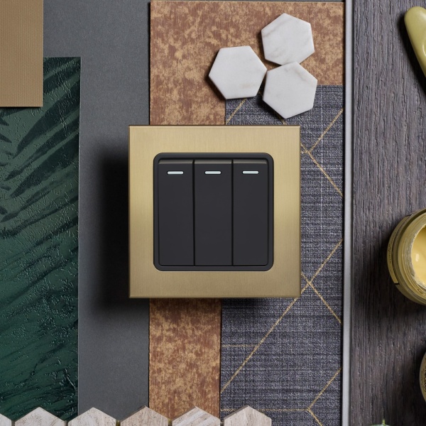 The Aura 3-Gang Retractive Switch in Brushed Brass offers a sleek and flexible solution for smart lighting control, blinds, or automation systems. Its modern aluminium front panel and minimalist design provide a sophisticated finish that suits any interior. Designed with a two-stage modular system, the base unit is installed first, followed by the front panel after decorating—ensuring a clean, mark-free look. The retractive (momentary) action makes it perfect for use with smart relays, dimmers, or control systems. Need a change in style? Just clip on a new panel—no rewiring required. Durable and design-forward, it's ideal for residential or commercial spaces where style meets smart functionality.
