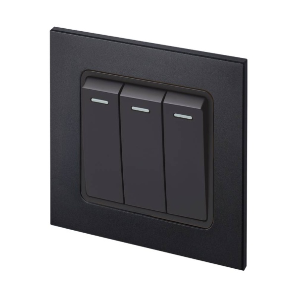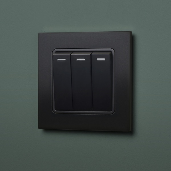 The Aura 3-Gang Retractive Switch in Matt Black offers a sleek and flexible solution for smart lighting control, blinds, or automation systems. Its modern aluminium front panel and minimalist design provide a sophisticated finish that suits any interior. Designed with a two-stage modular system, the base unit is installed first, followed by the front panel after decorating—ensuring a clean, mark-free look. The retractive (momentary) action makes it perfect for use with smart relays, dimmers, or control systems. Need a change in style? Just clip on a new panel—no rewiring required. Durable and design-forward, it's ideal for residential or commercial spaces where style meets smart functionality.
