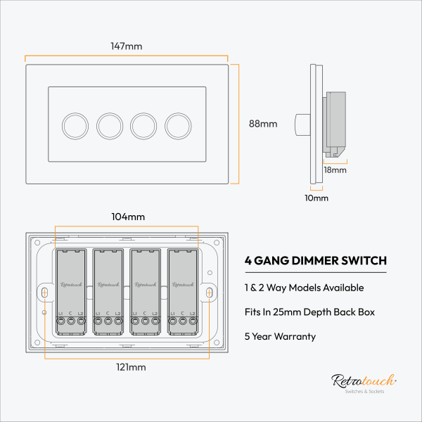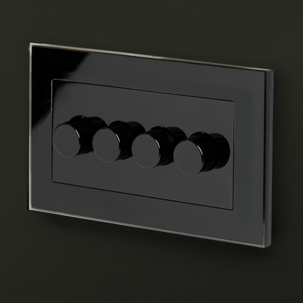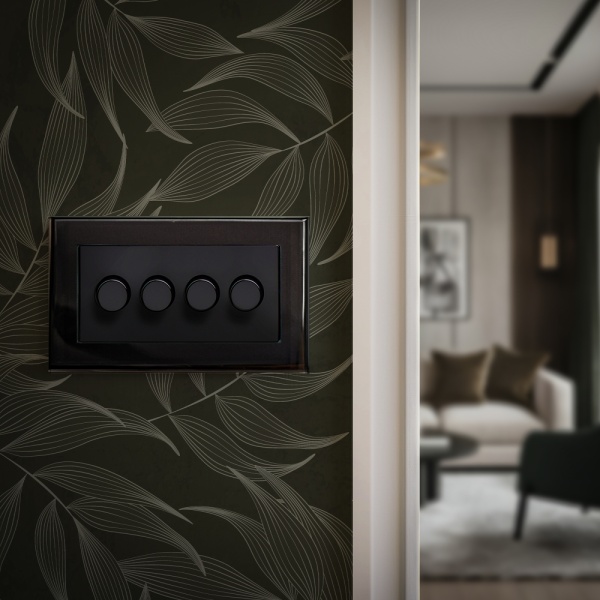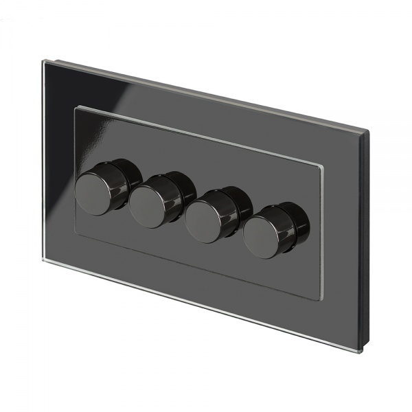 Set the mood in your home with our 4 Gang Rotary LED Dimmer Switches, designed for effortless control and timeless elegance. Part of Retrotouchs Crystal Range, these dimmer switches feature a premium glass design and a push on/off with smooth adjustable rotary dimming knob, allowing you to fine-tune your lighting to suit any mood or occasion and fit in a 25mm backbox. This 2-way rotary Dimmer can be paired with an on/off switch for control of a single lighting circuit from 2 locations. With a black glass exterior, these rotary dimmer switches blend seamlessly into your decor while adding a touch of sophistication. Whether you're hosting a dinner party or enjoying a quiet evening, our dimmer switches provide the perfect balance of style and functionality.