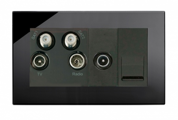 This TV, Radio, and SAT socket features a screened design and is compatible with a duplexer. It is enhanced with a glass surround and chrome trim, offering a sleek and modern aesthetic. The socket also includes concealed fixing screws for a clean, polished installation.