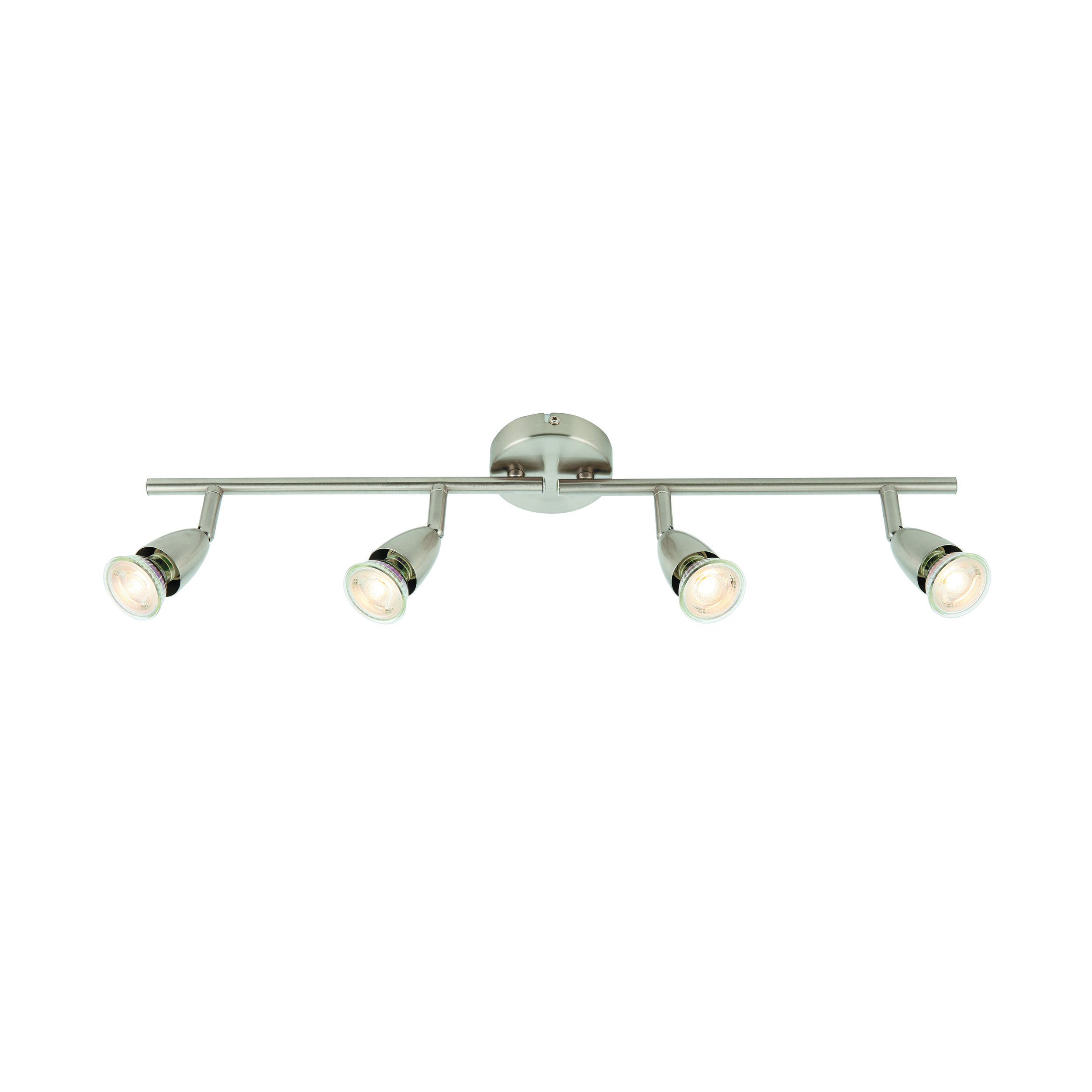 A simple four light spotlight bar from the Amalfi range finished in satin nickel. Fully adjustable so light can be directed exactly where you need it. Suitable for commercial and domestic use. Matching items and different colour options available