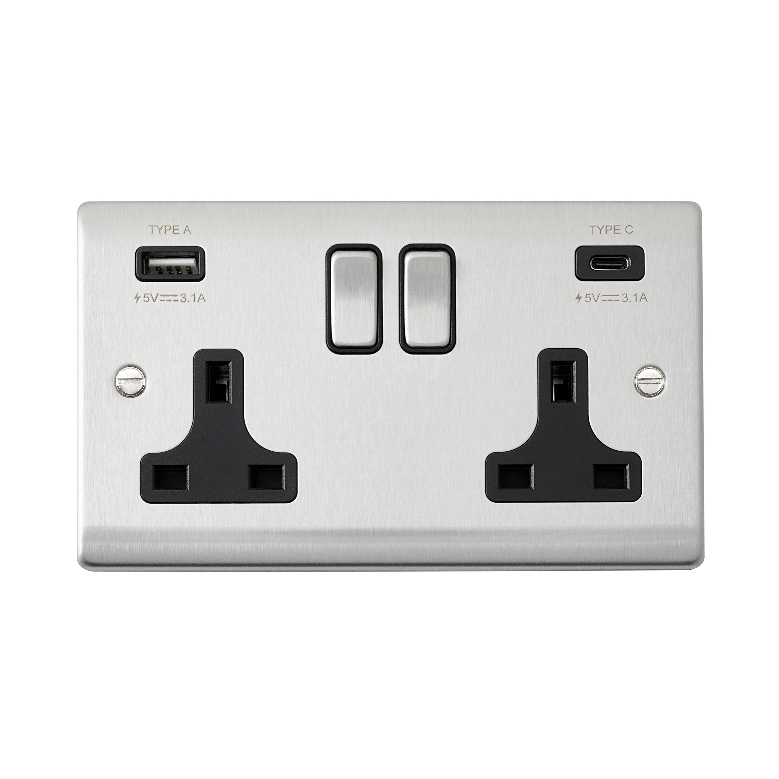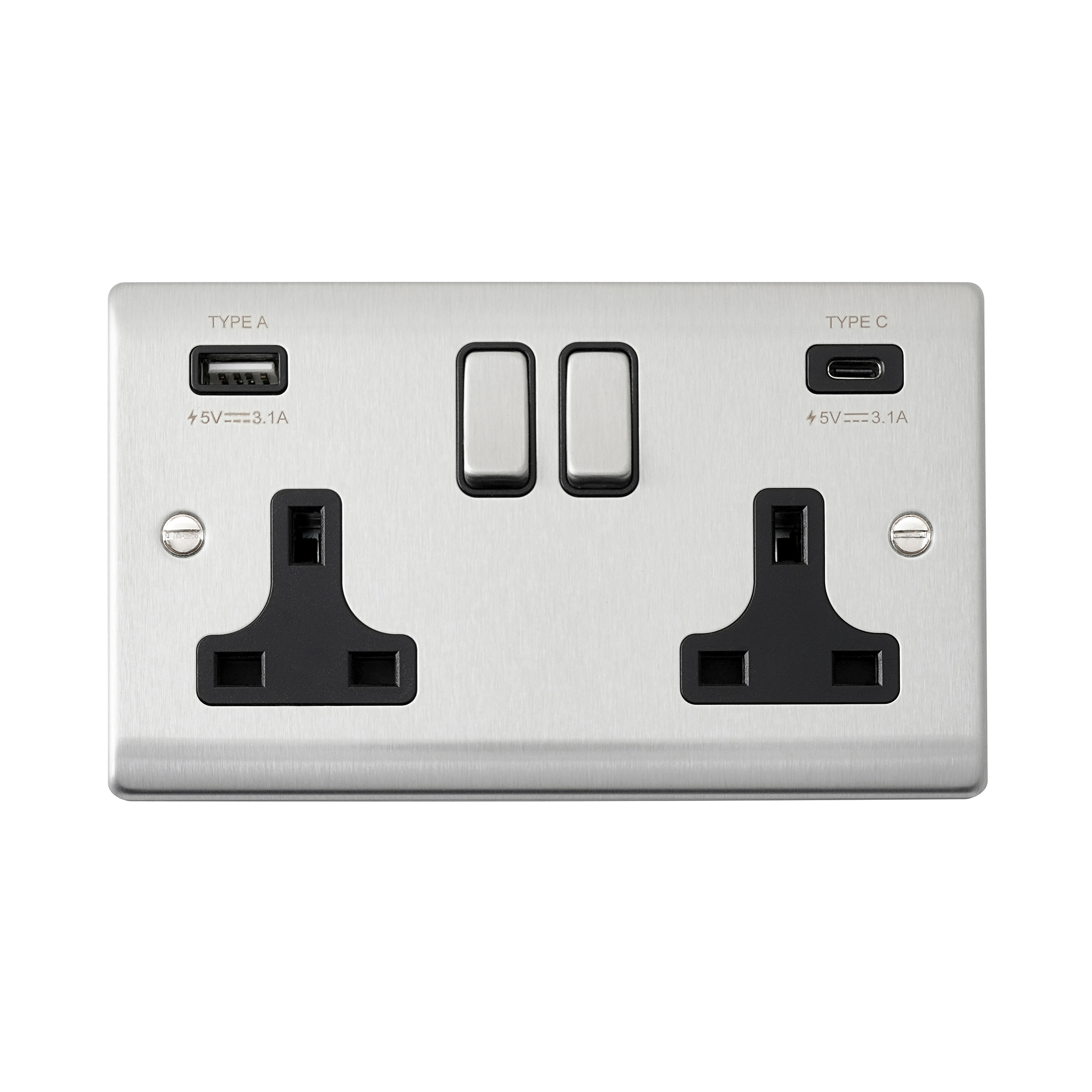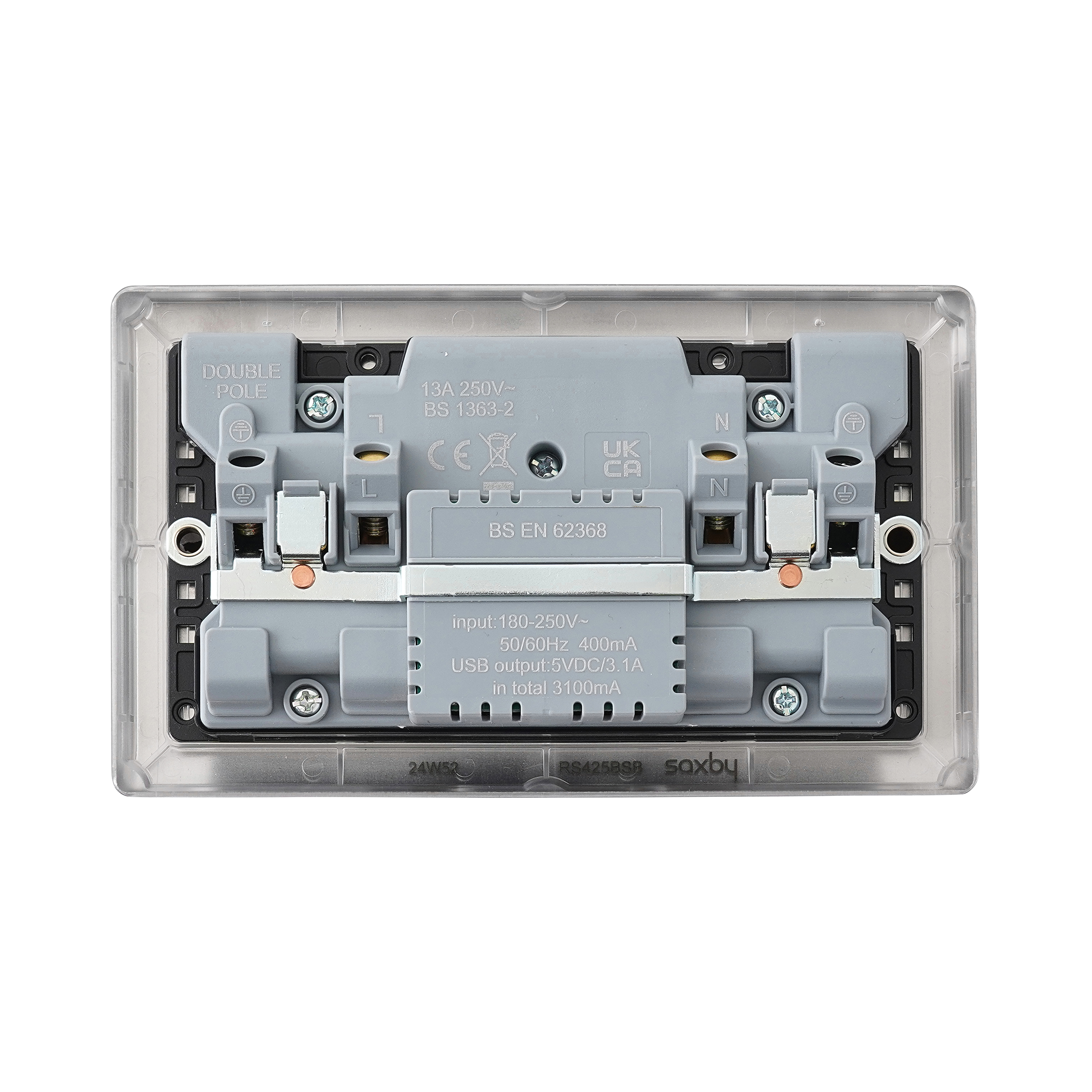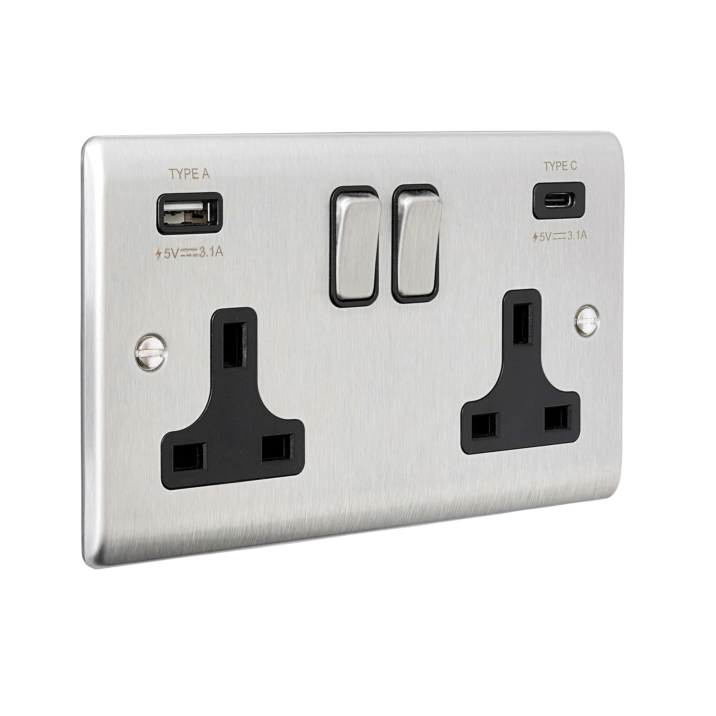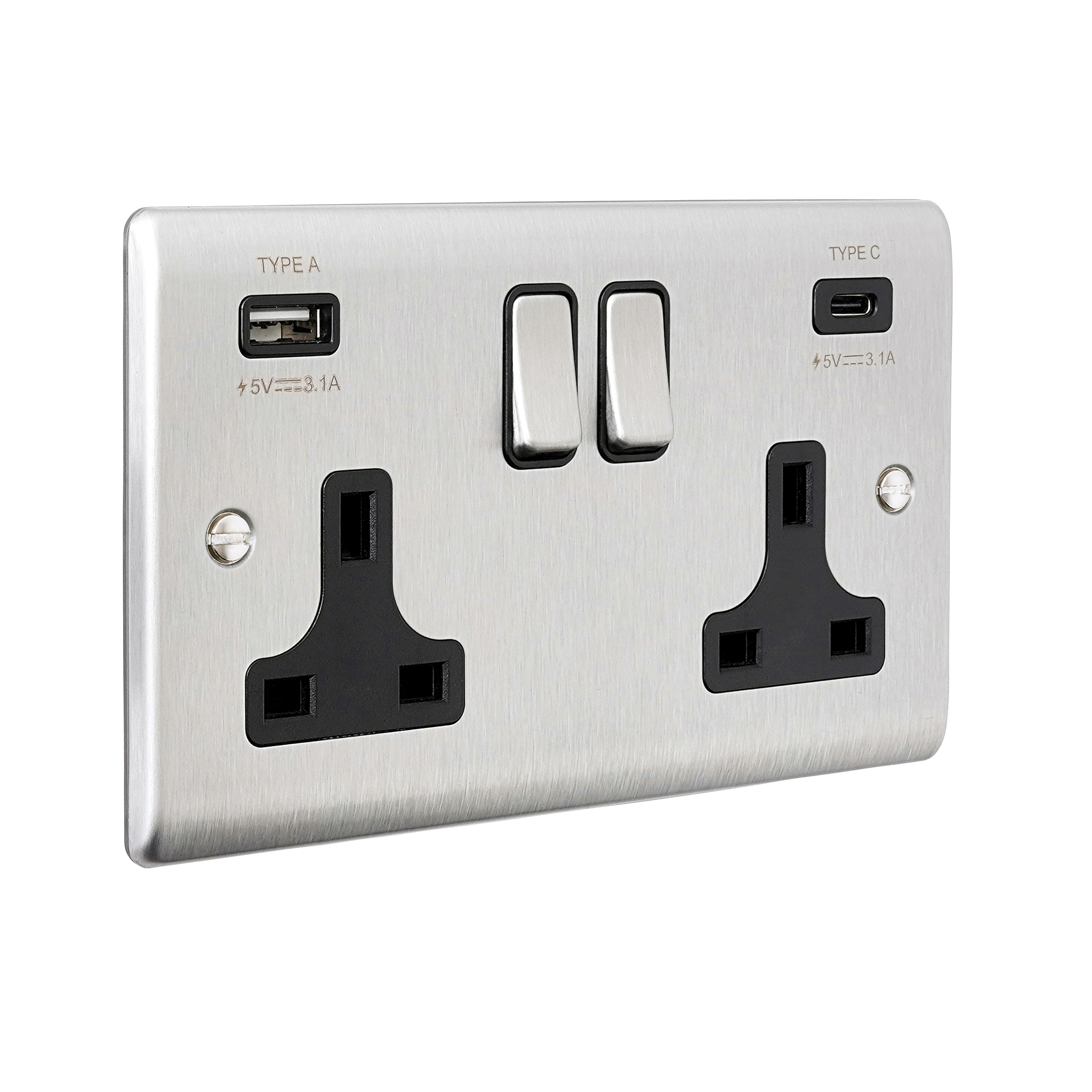 Our 13A rated socket boasts angled in-line terminals with captive screws which provide for quick and easy access and a hassle free installation. Integrated USB A + C ports. Supplied with fixing screws. Twin earth fitted as standard to allow a double earth facility for installations that require a high integrity protective connection . Double pole switching for the peace of mind of a safer installation of your socket