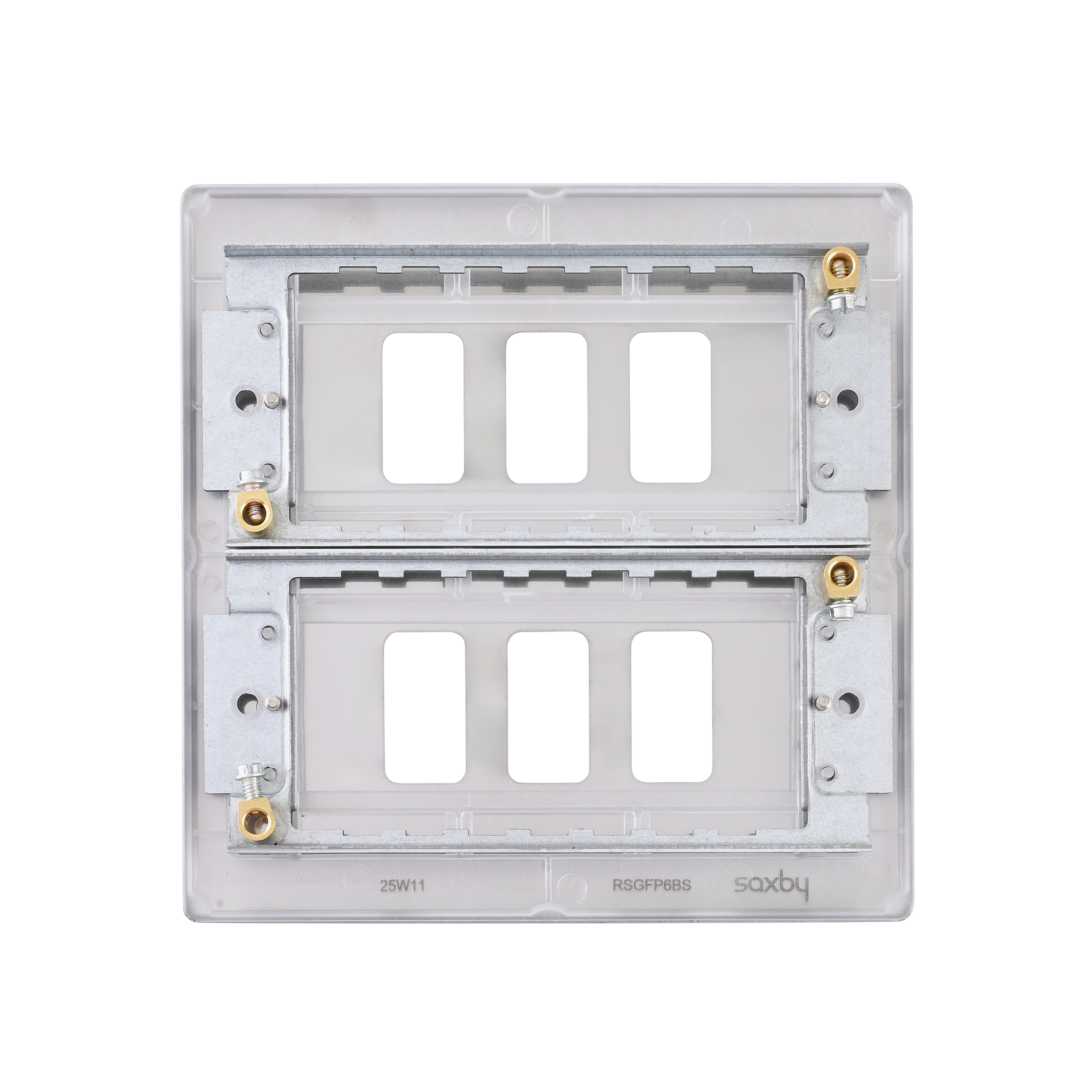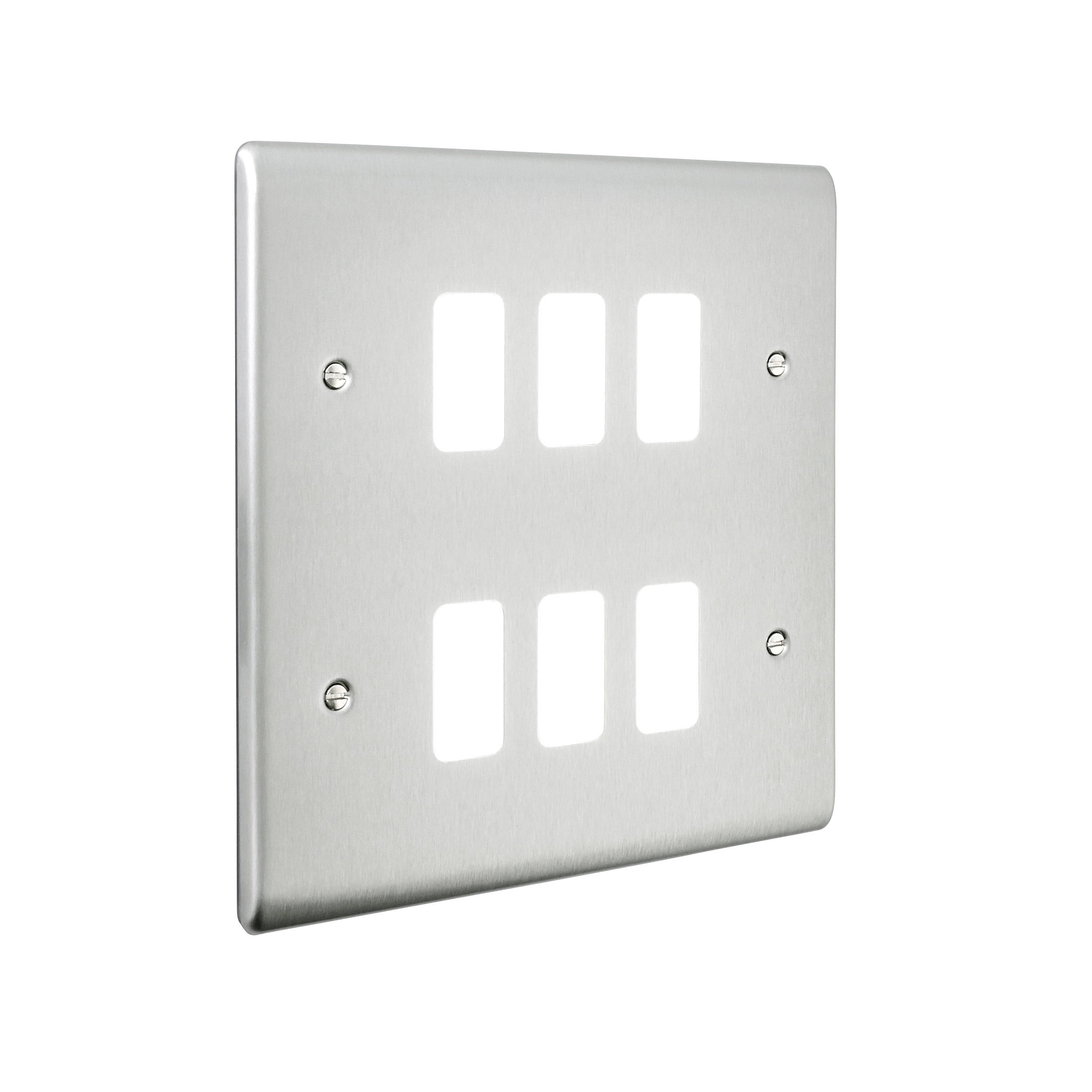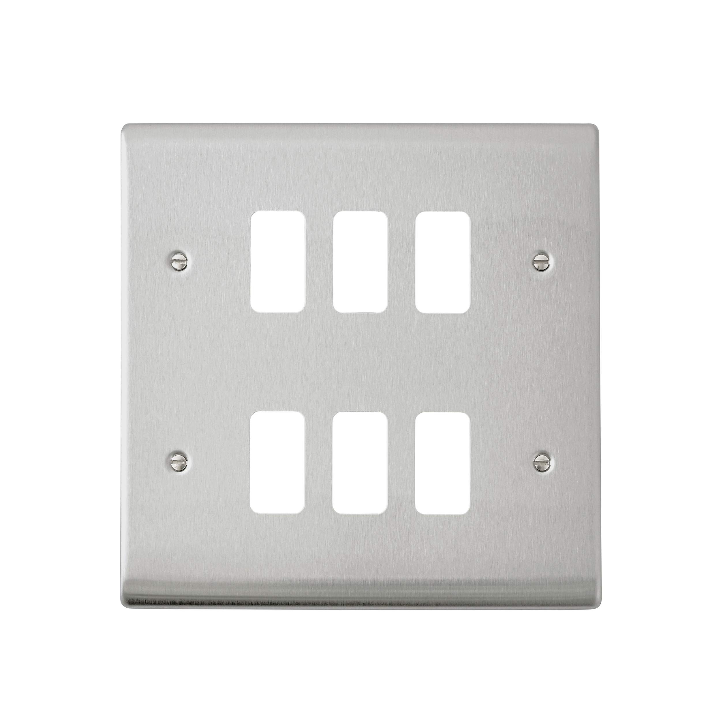Yolk supplied with every grid plate as standard allowing for quick, easy and hassle free installation. Supplied with fixing screws. No visible plastic around the rockers. Moisture gasket as standard to help prevent any moisture transfer to decorative front plate. This plate accommodates 6 modules