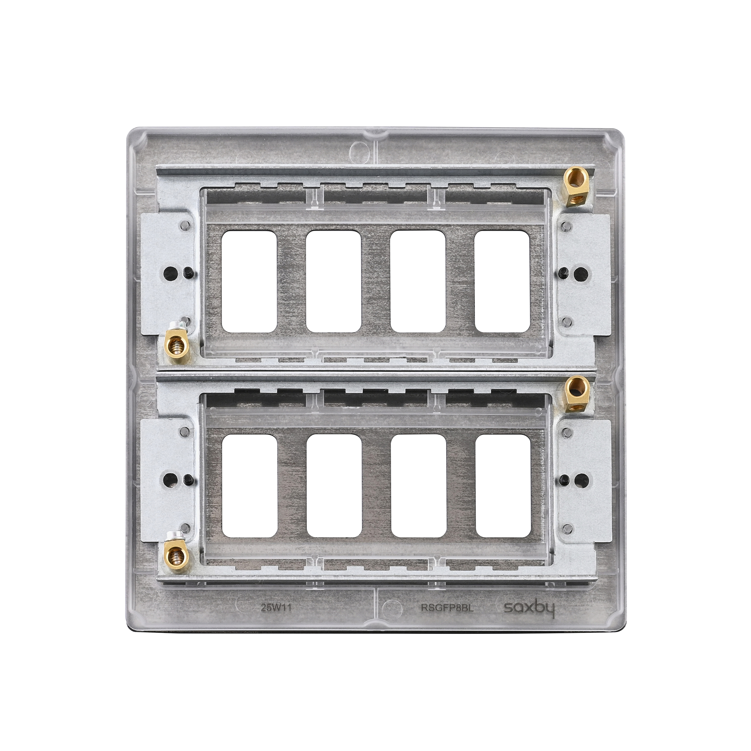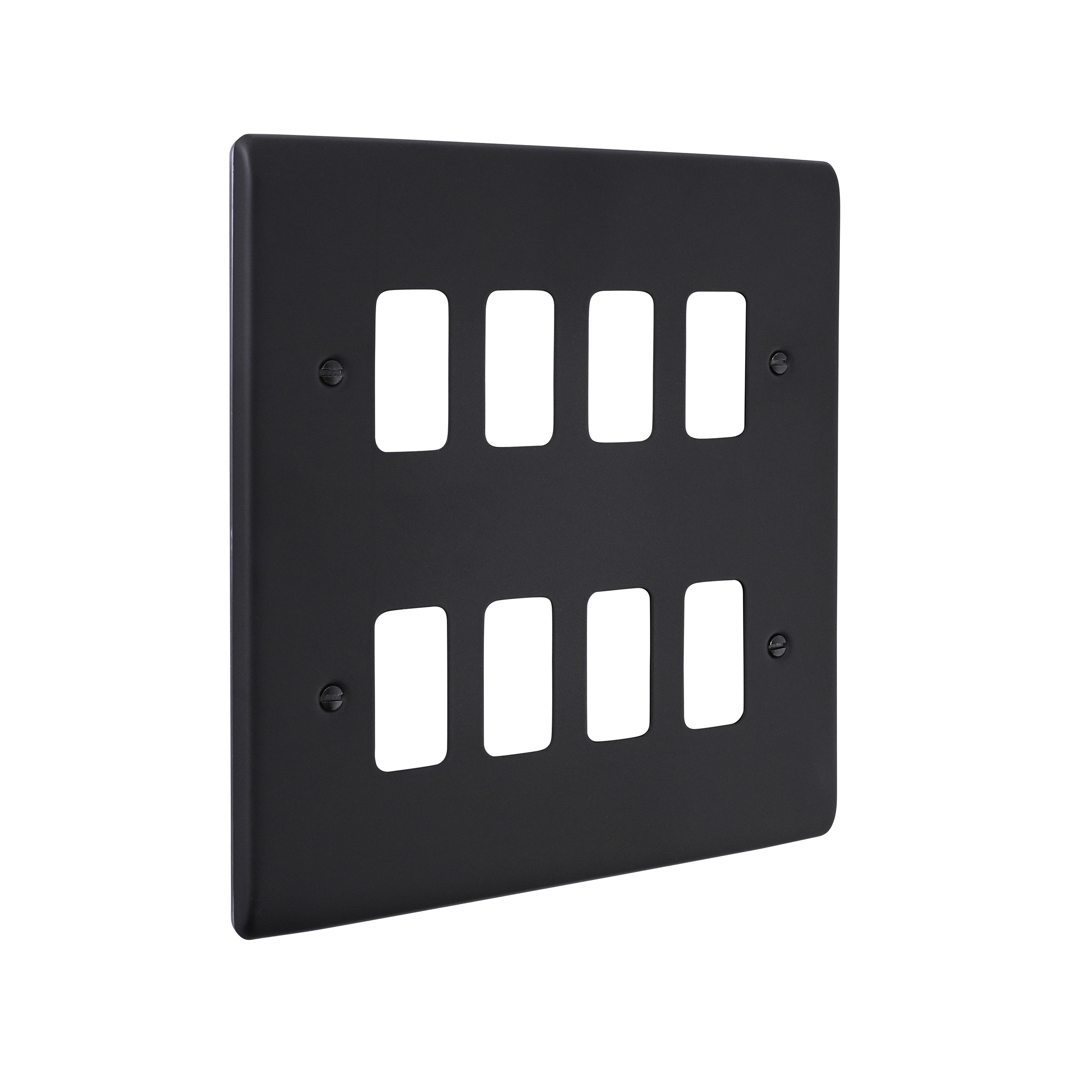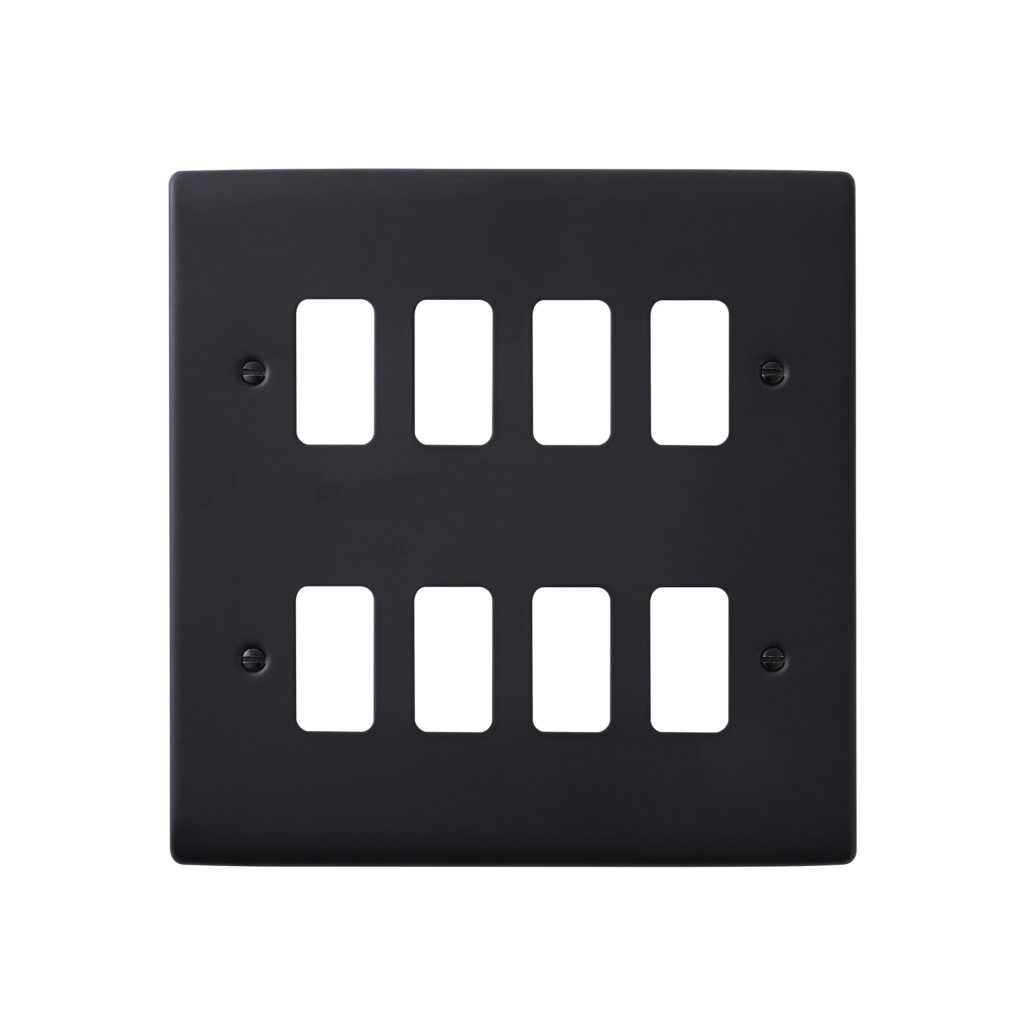 Yolk supplied with every grid plate as standard allowing for quick, easy and hassle free installation. Supplied with fixing screws. No visible plastic around the rockers. Moisture gasket as standard to help prevent any moisture transfer to decorative front plate. This plate accommodates 8 modules