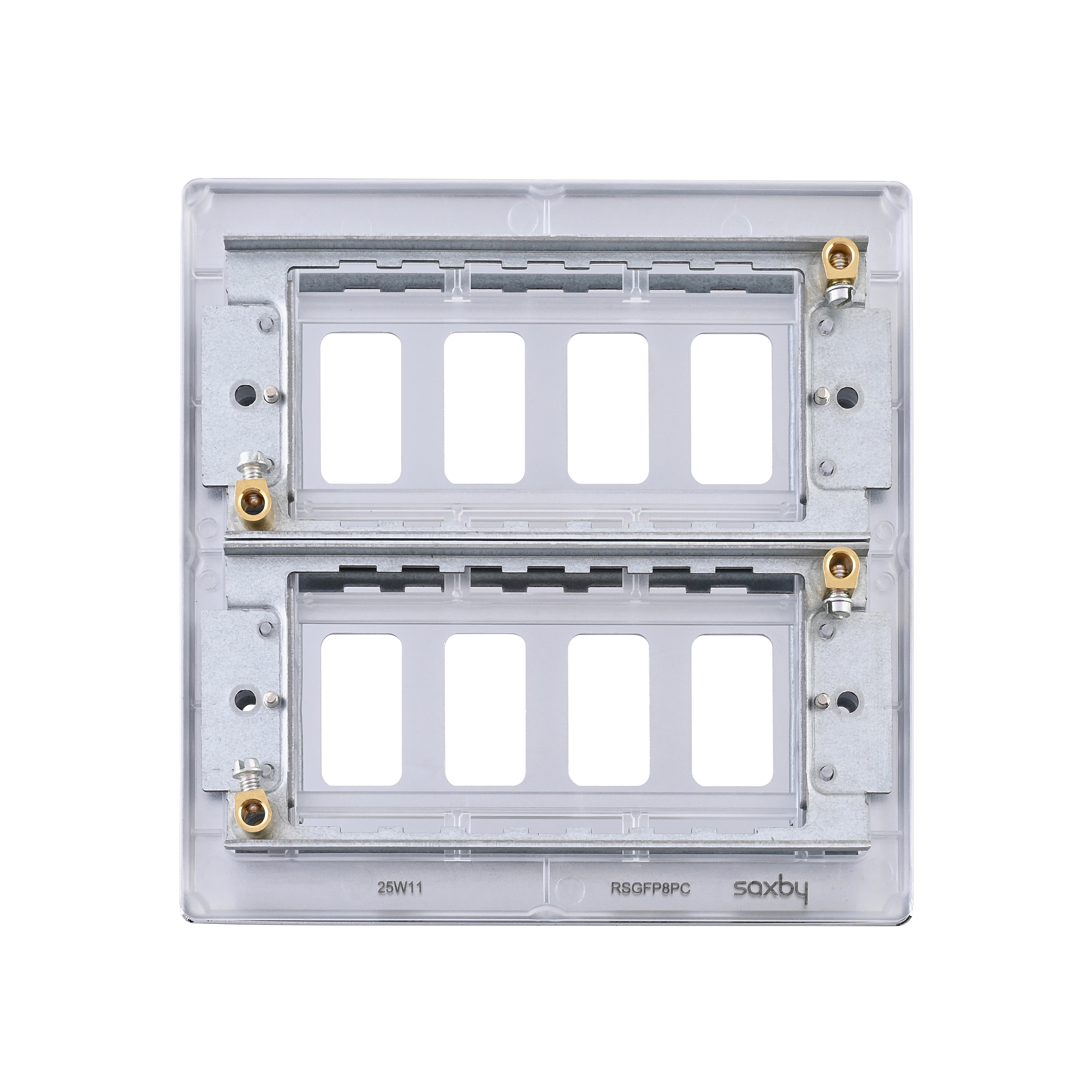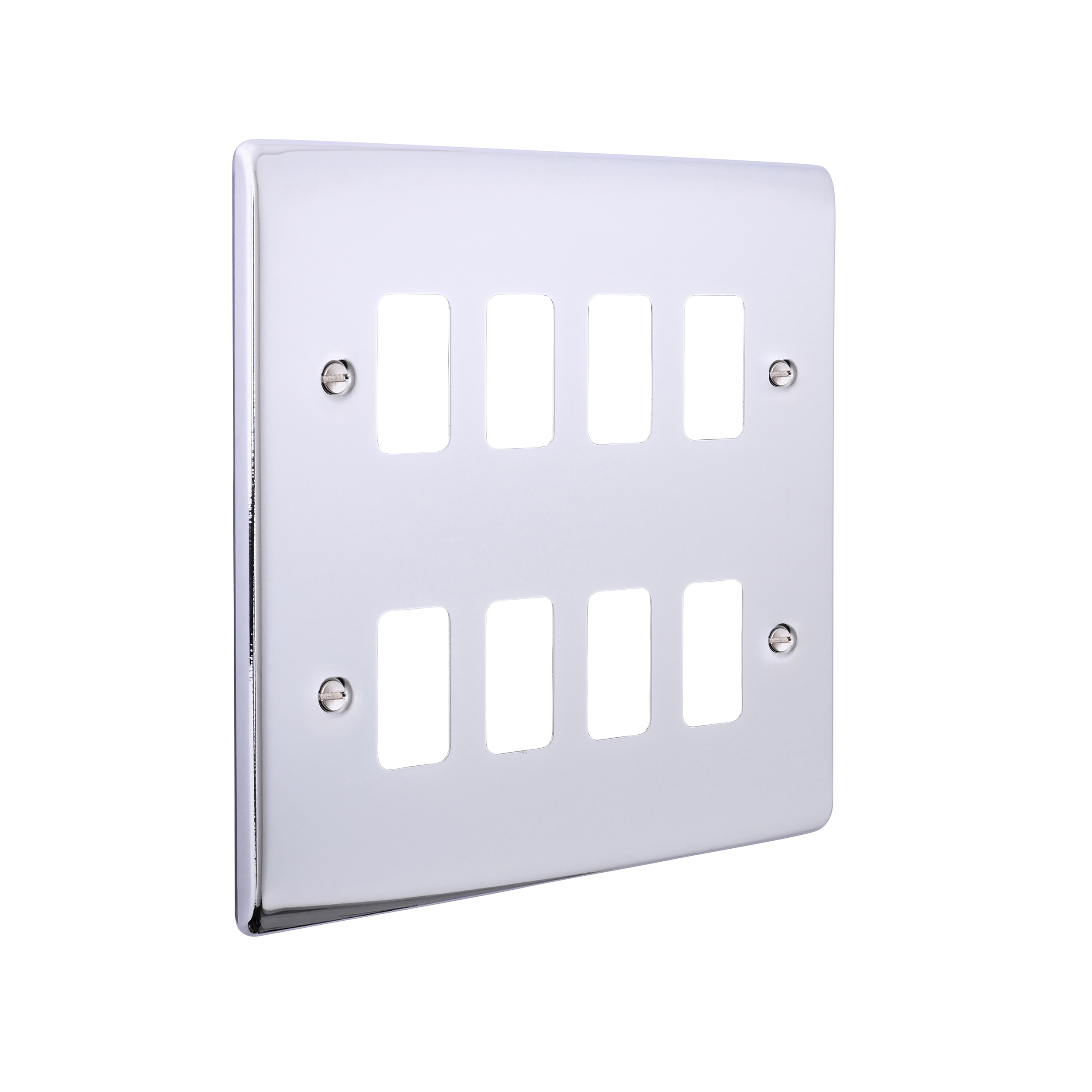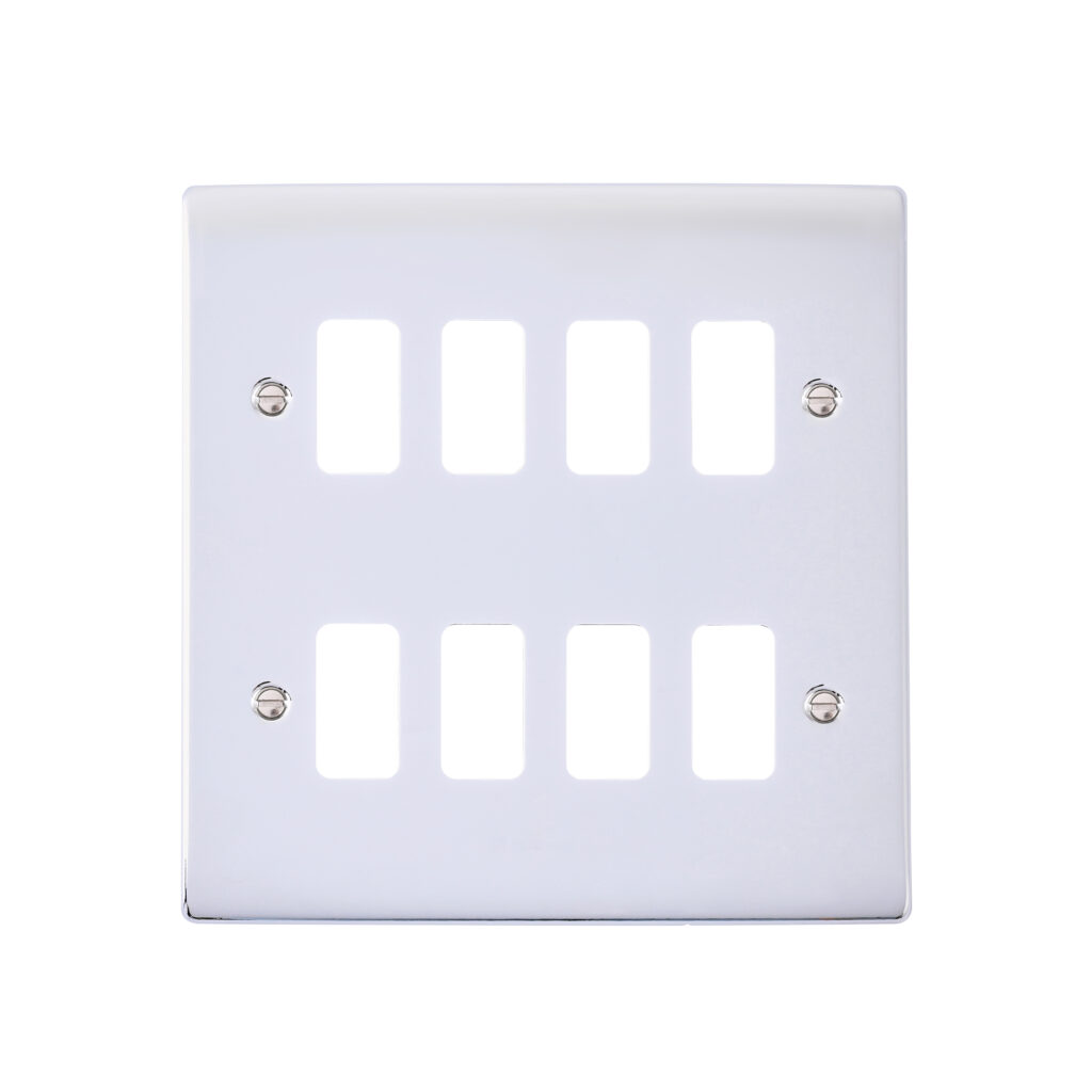 Yolk supplied with every grid plate as standard allowing for quick, easy and hassle free installation. Supplied with fixing screws. No visible plastic around the rockers. Moisture gasket as standard to help prevent any moisture transfer to decorative front plate. This plate accommodates 8 modules