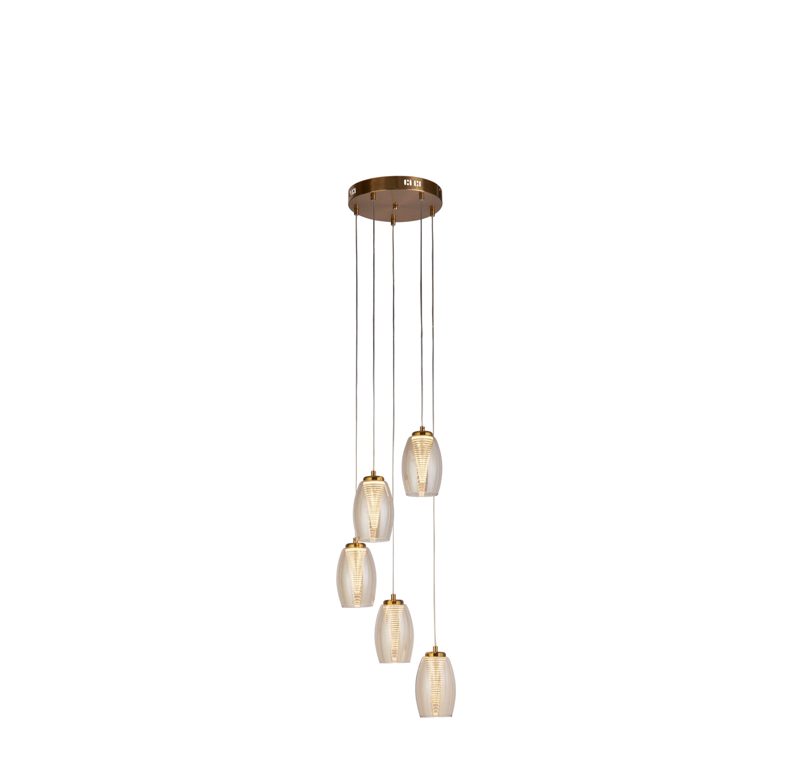 The Cyclone 5Lt Multi-drop pendant seamlessly blends the opulence of bronze with the captivating allure of champagne glass accents. This pendant emanates an air of refined elegance, infusing any space it graces with a touch of luxury and sophistication and works with many interior design styles.
