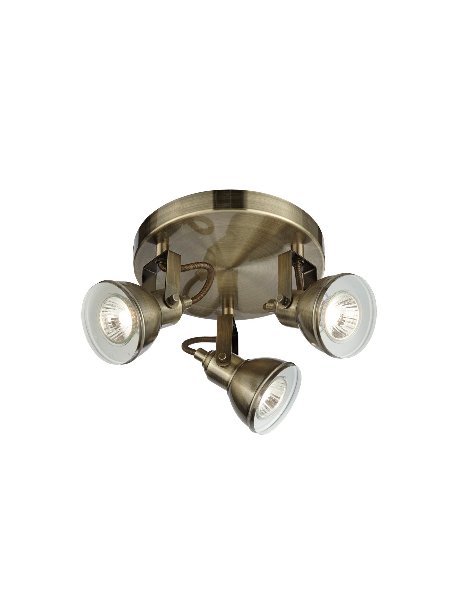 This focus antique brass 3 light ceiling spotlight with round plate provides an attractive, central source of light for any room in your home. The modern fitting has three adjustable spotlights, mounted on a round plate, and a classic antique brass finish.