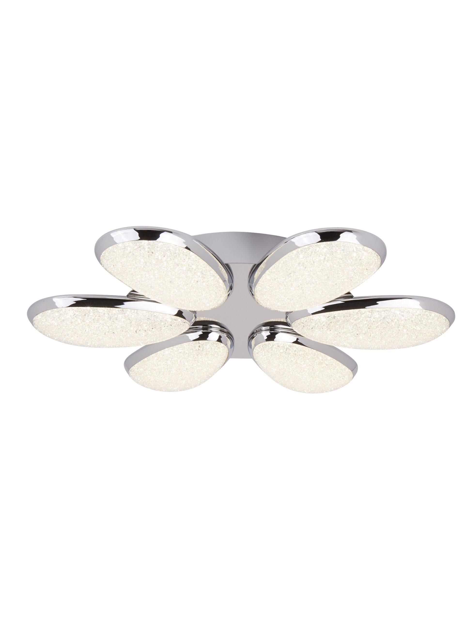 Featuring an eye-catching floral inspired design with 6 lights, in crushed ice effect glass and chrome. This creates a contemporary and stylish feel to the light. This light is idea for any modern living space, particularly dining rooms. LED’s use up to 75% less energy and last up to 20 times longer than incandescent bulbs.