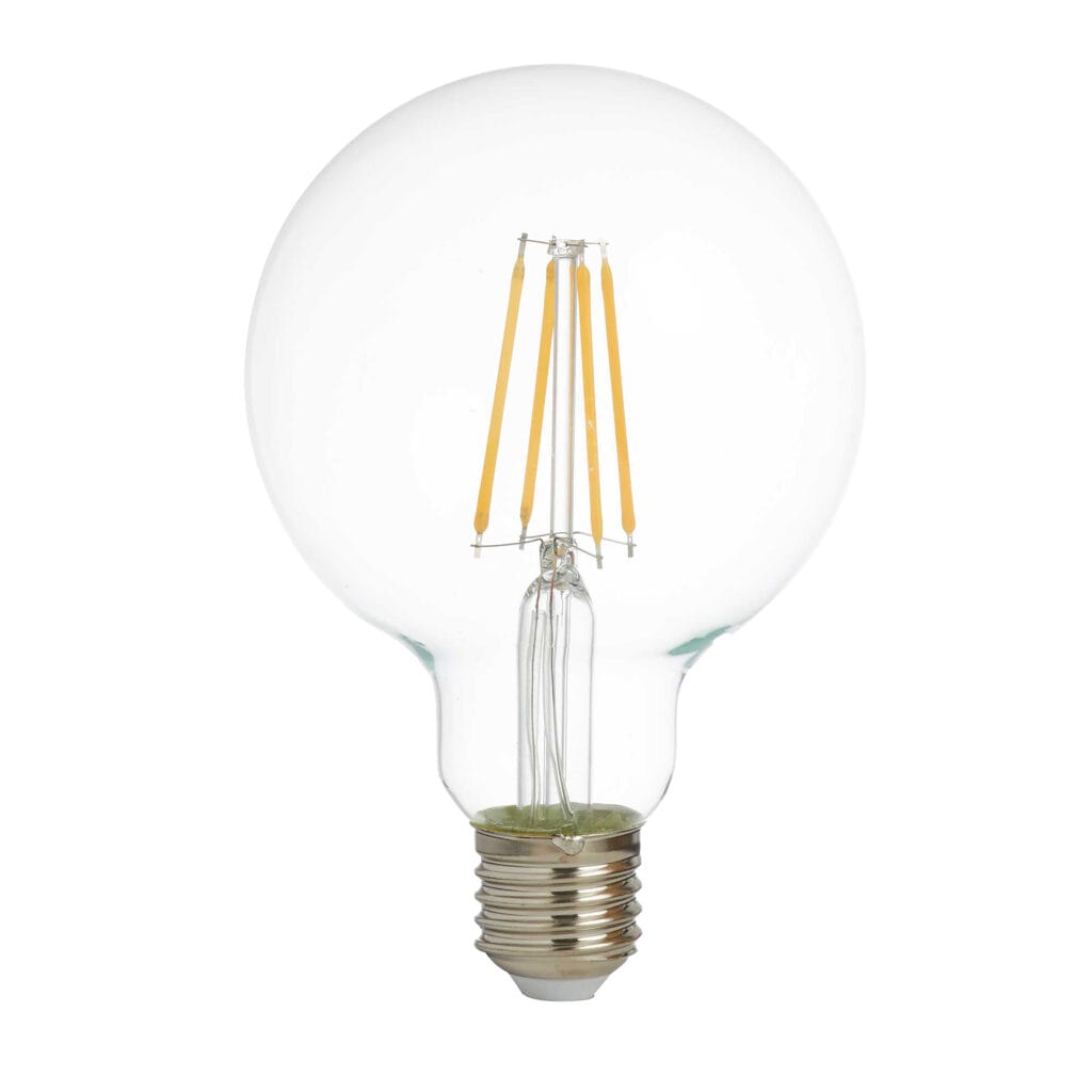 A pack of 5 filament globe lamps with an clear glass finish. The lamp is dimmable and uses LED energy efficient technology. Suitable to fit in an ES socket of 27mm, this lamp has 6 watts and a lumen rating of 600. LED’s use up to 75% less energy and last up to 20 times longer than incandescent bulbs.