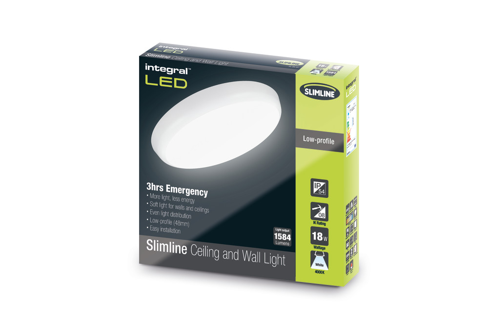 Integral Slimline Ceiling/Wall Light Emergency 3Hr 18W 4000K Non-Dimm White 100Lm/W