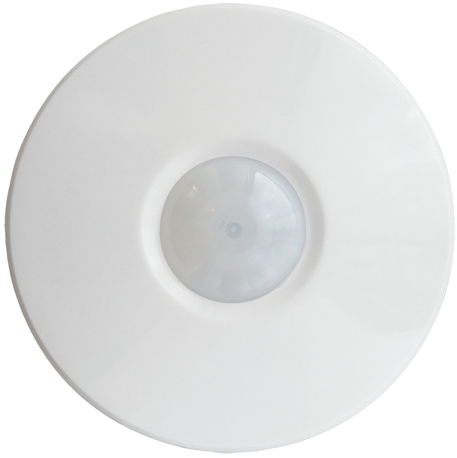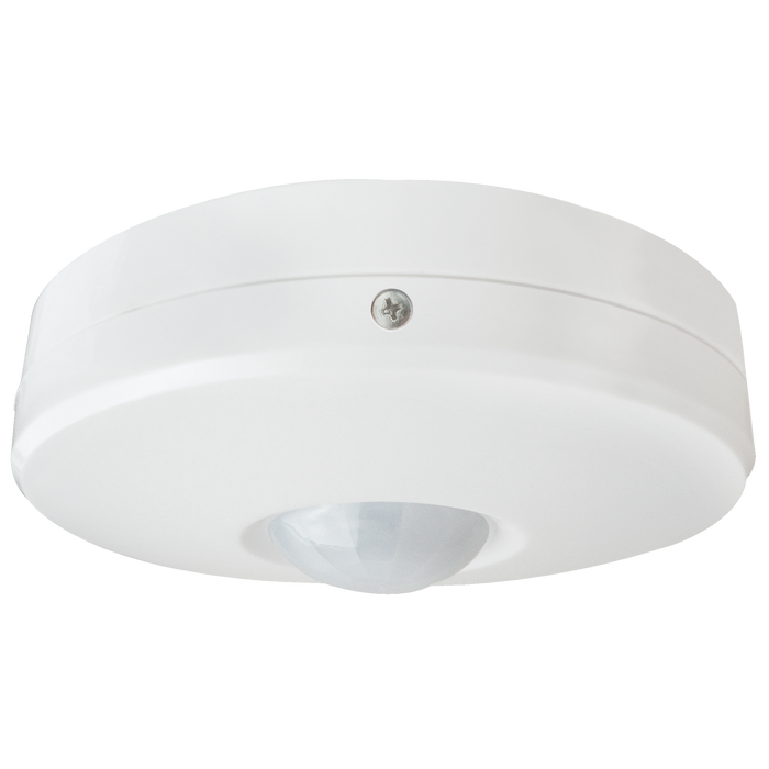 Surface mounted white stand alone PIR sensor, 360 degree detection zone with 4 metre detection radius, adjustable lux level and time setting built in. Able to control incandescent loads up to 1600W and LED loads up to 200W