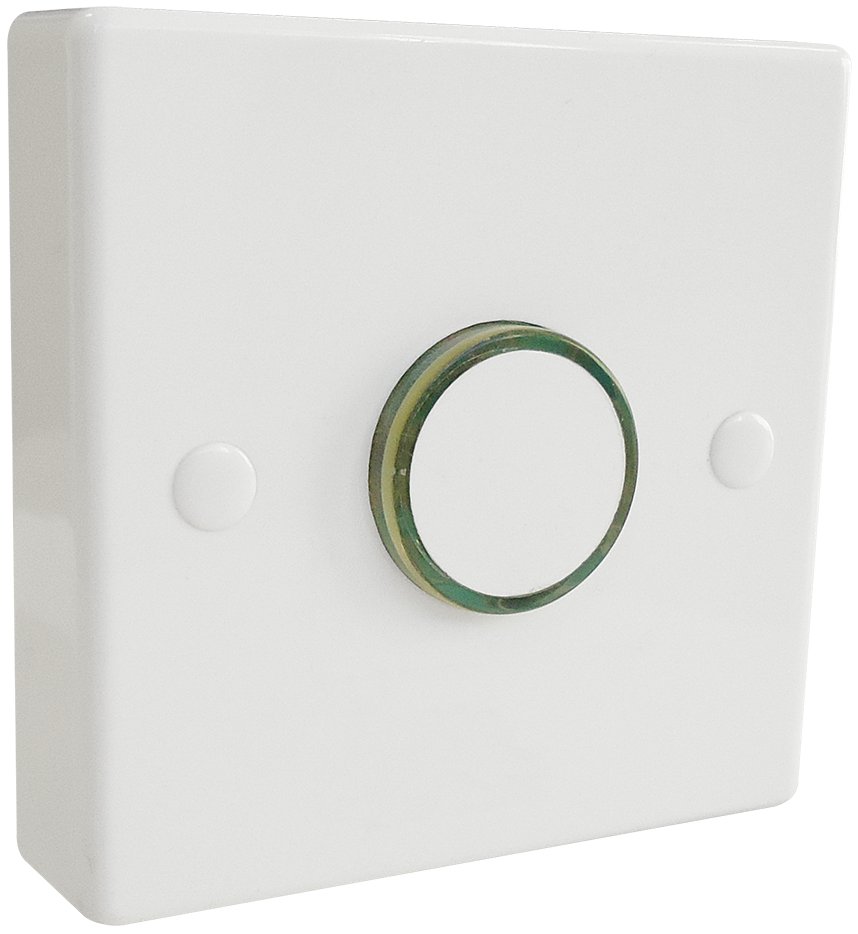Electronic time delay push switch compatible with LED, fluorescent and incandescent loads, with a red halo indication light around the switch for easy location, time adjustment from 12 seconds to 12 minutes with no neutral required to replace an existing switch