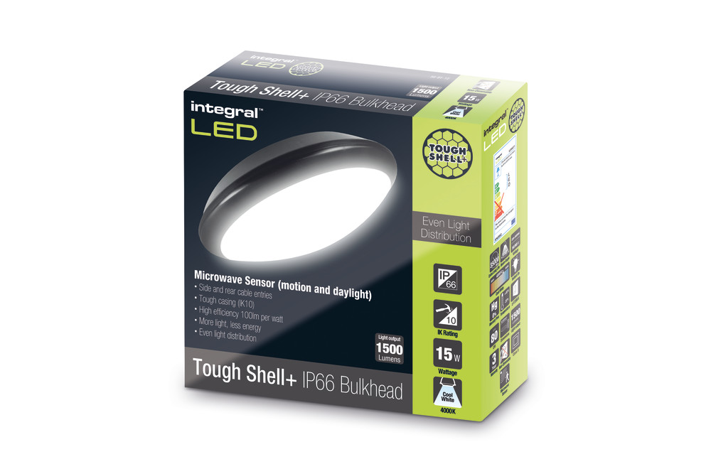 The Integral LED 15W low-energy Tough-Shell+ IP66 Bulkhead has a back-lit LED design that provides a 110 degree beam angle and an even light distribution, available in a black and white finish.